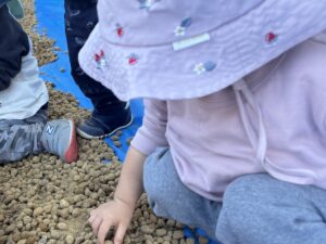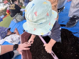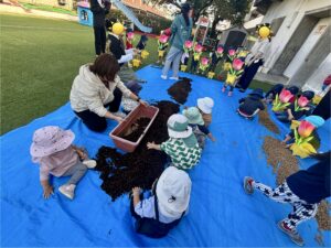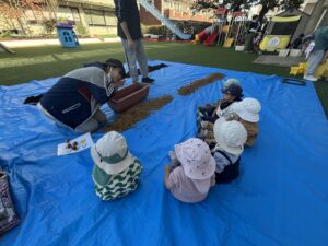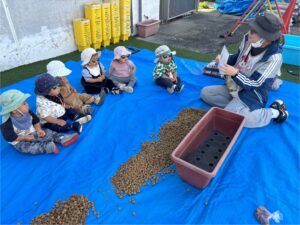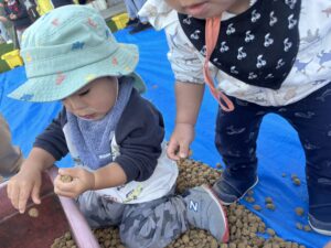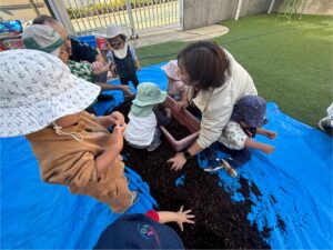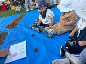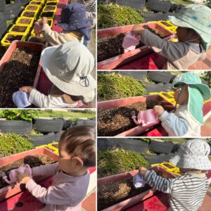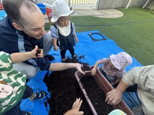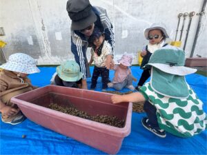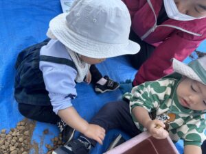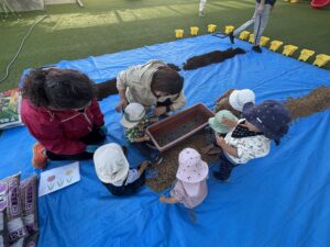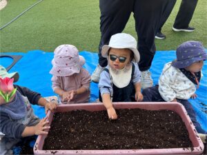 土をさわって「つめたいね」「ふわふわ~」と笑顔いっぱい。