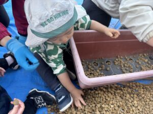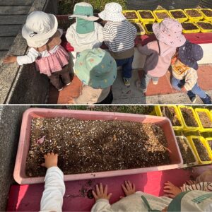 土をさわって「つめたいね」「ふわふわ~」と笑顔いっぱい。