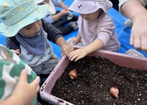 『先生絶対まちがえてるよ』ムードの子どもたち。小さな球根がチューリップになるなんて信じられない様子です💦