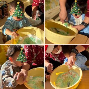 重曹に色水をかけて「しゅわしゅわクリスマスリース」を作りました。
