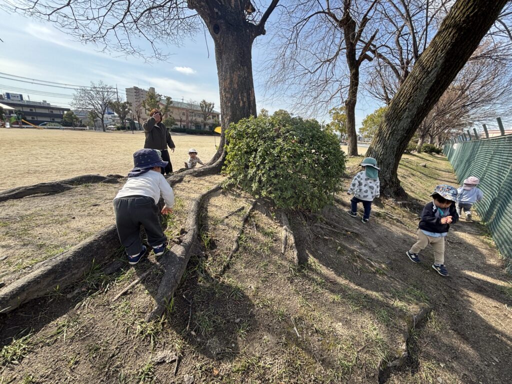 大きな木の根っこの周りで飛んだり登ったり、自然アスレチック🌳