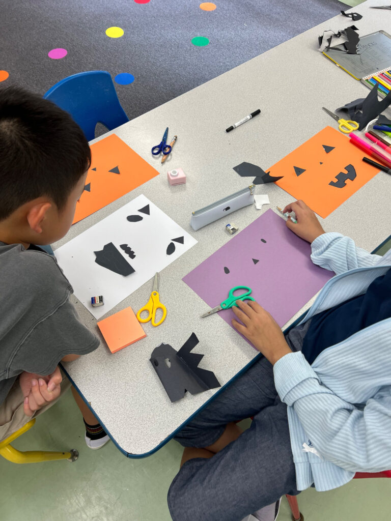 子ども達はA4用紙を使って、おなじみのハロウィンのモンスターを作りました。体のパーツや飾りをつけて、工作を完成させました!