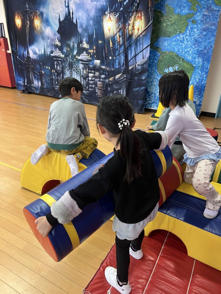 子どもたちは体操器具を使い、チームとして協力して海(体育館の床)を渡りました。困難ではありましたが、よくコミュニケーションを取り合い、無事に反対側へたどり着きました!