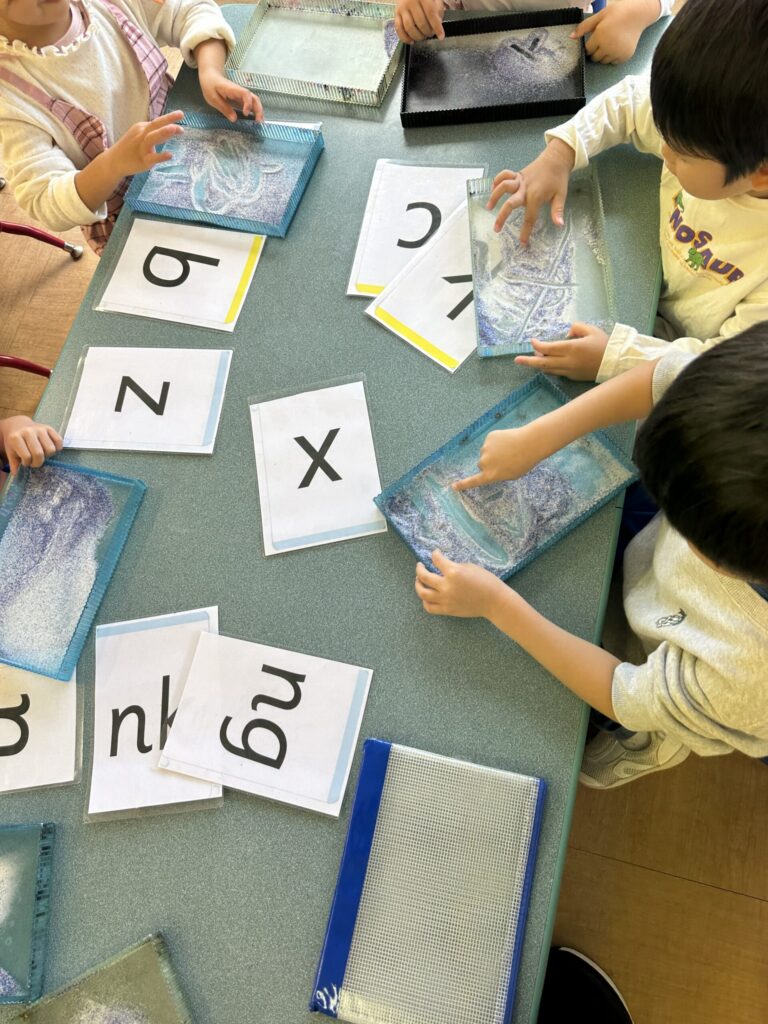 砂を使って楽しく文字を書く練習をしました。子どもたちは文字カードを見ながら、トレイの上で一文字ずつなぞる作業を楽しみました。