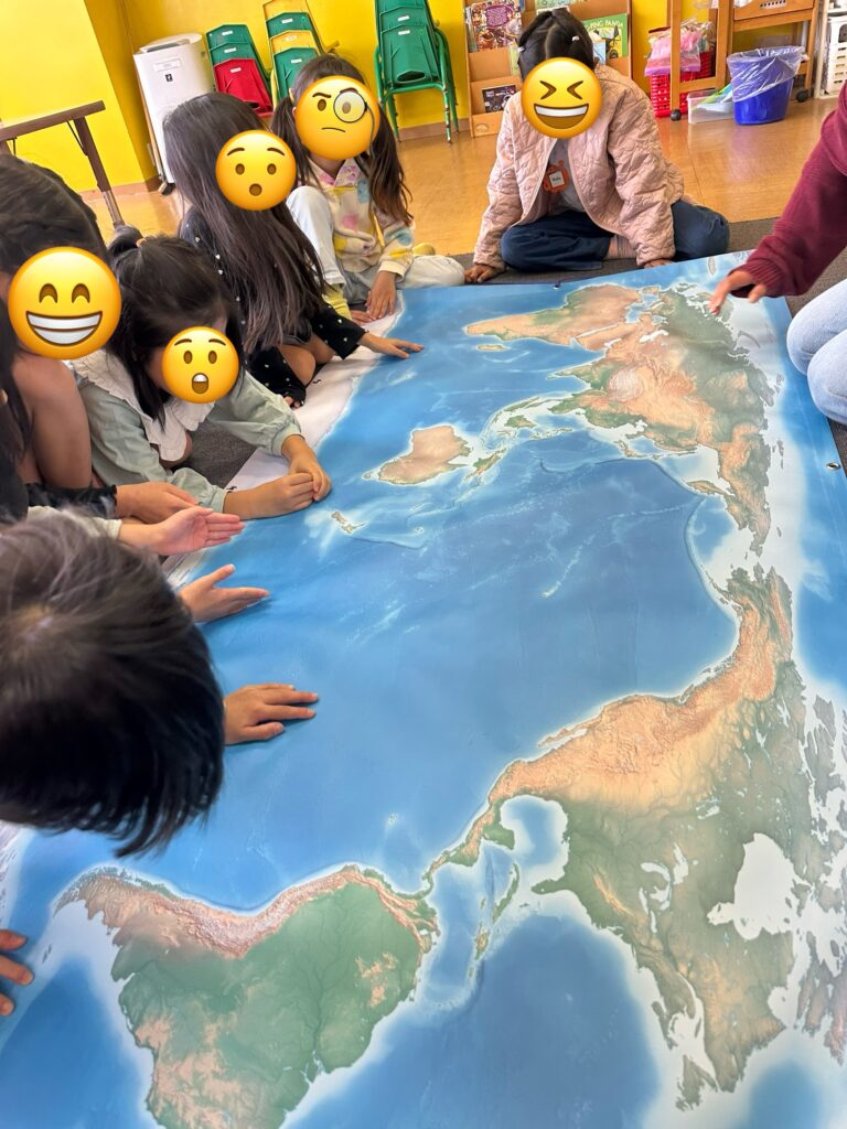 大きな世界地図を使って、国や大陸についての知識を試しました!それぞれの国が紹介されるたびに、子どもたちはその場所について知っている面白いことや知識を共有しました。