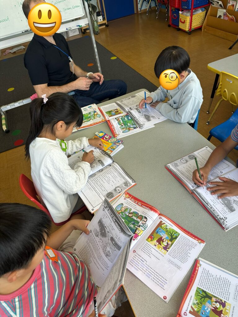 教科書を使う時間に少人数グループに分かれて活動しています。追加のサポートのおかげで、普段は控えめな子どもたちも積極的に発言するようになり、質問に答える自信がついてきました!