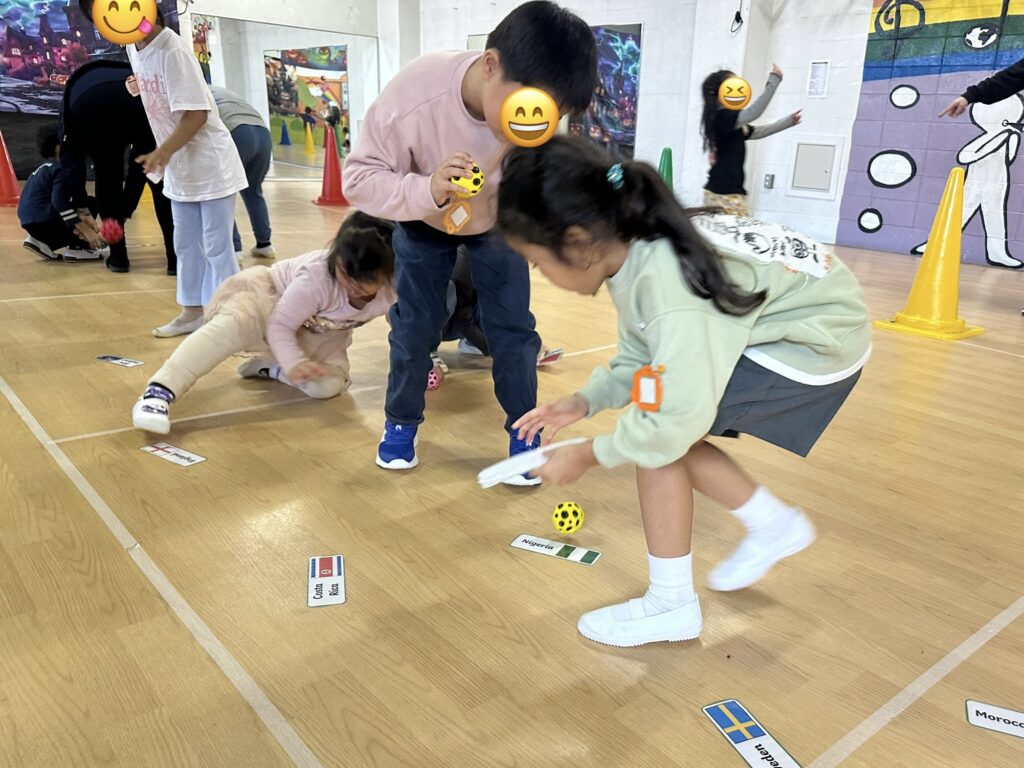 ペアを組んで、一人がコーンの周りでボールを蹴り、もう一人ができるだけ多くの国を集めようとしました!最後に、どのチームが最も多くの国を集めたかを比べました!