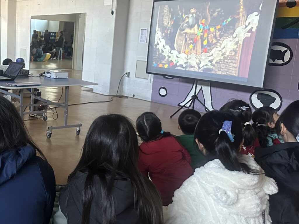 While waiting for their turn to meet Santa, the other children gathered in the gym to watch Shaun the Sheep: A Flight Before Christmas. The children were completely engrossed in the movie—it was hard to pull the classes away when it was time to move on!