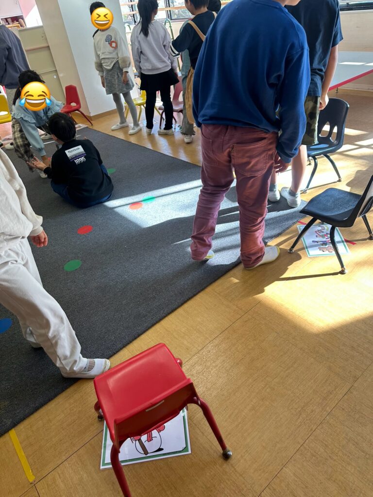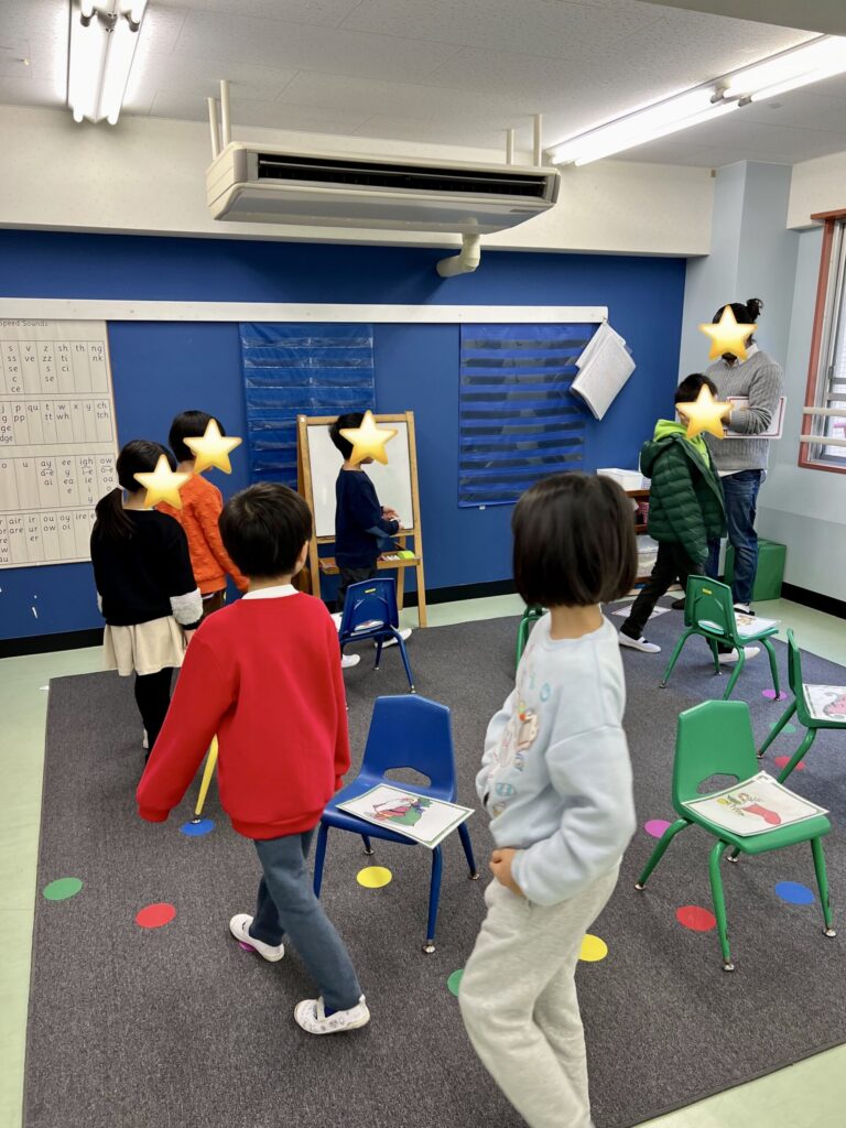 RedクラスとBlueクラスは、クリスマスにちなんだボキャブラリーを習得するため、楽しい椅子取りゲームをしました。椅子の下にフラッシュカードが置かれ、音楽が止まったら子ども達は空いている椅子を探さなければなりません。先生が指定したカードの上に座ってしまった子は脱落!動きと言語学習を組み合わせた楽しい活動でした!
