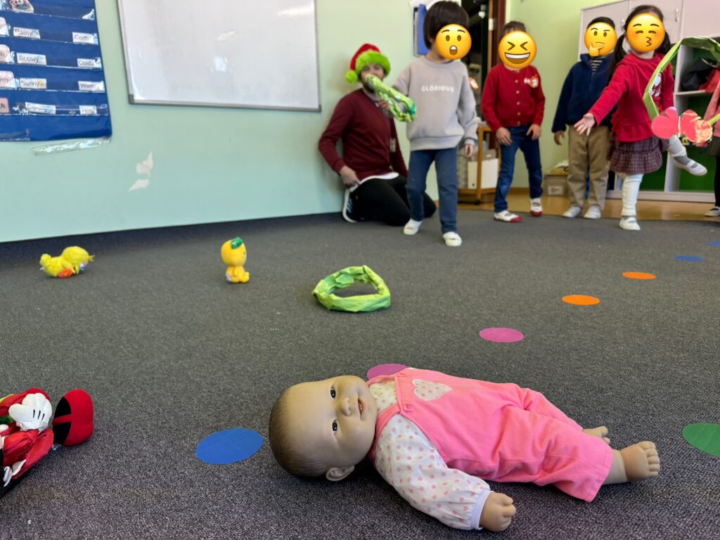 Owlsクラスは今日、様々な遊びを楽しみました。特に人気だったのは輪投げです。カーペットの上に置かれたおもちゃに向かって輪を投げ、誰が一番遠くにあるおもちゃに届くかを競い合い、楽しそうに挑戦していました。ちなみに手前の赤ちゃんは人形です!びっくりさせてごめんなさい…。