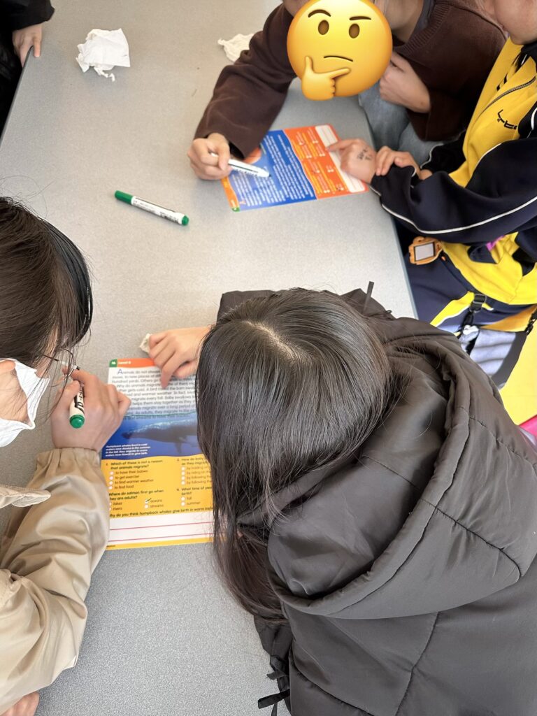 Advanced Greenクラスは読解力を高めるための読書活動に取り組みました。まず質問を読み、ホワイトボードマーカーで本文中のヒントとなる部分を下線を引きながら確認しました。ペアワークにより長めの物語にも臆することなく、互いに助け合いながら答えを探しました。