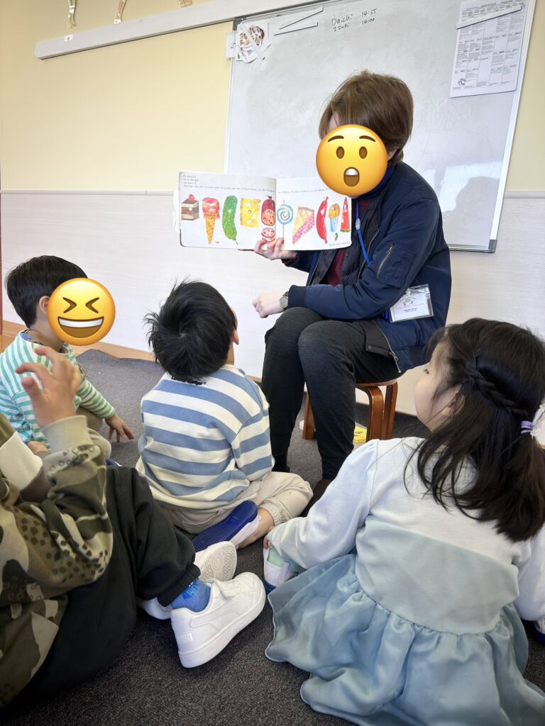 ChicksクラスとSparrowsクラスは、読み聞かせの時間に『はらぺこあおむし』に親しみました。何人かの子はすでにこのお話を知っていて、先生がページをめくる前に、あおむしが次に何を食べるか当てることができました。素晴らしい記憶力!