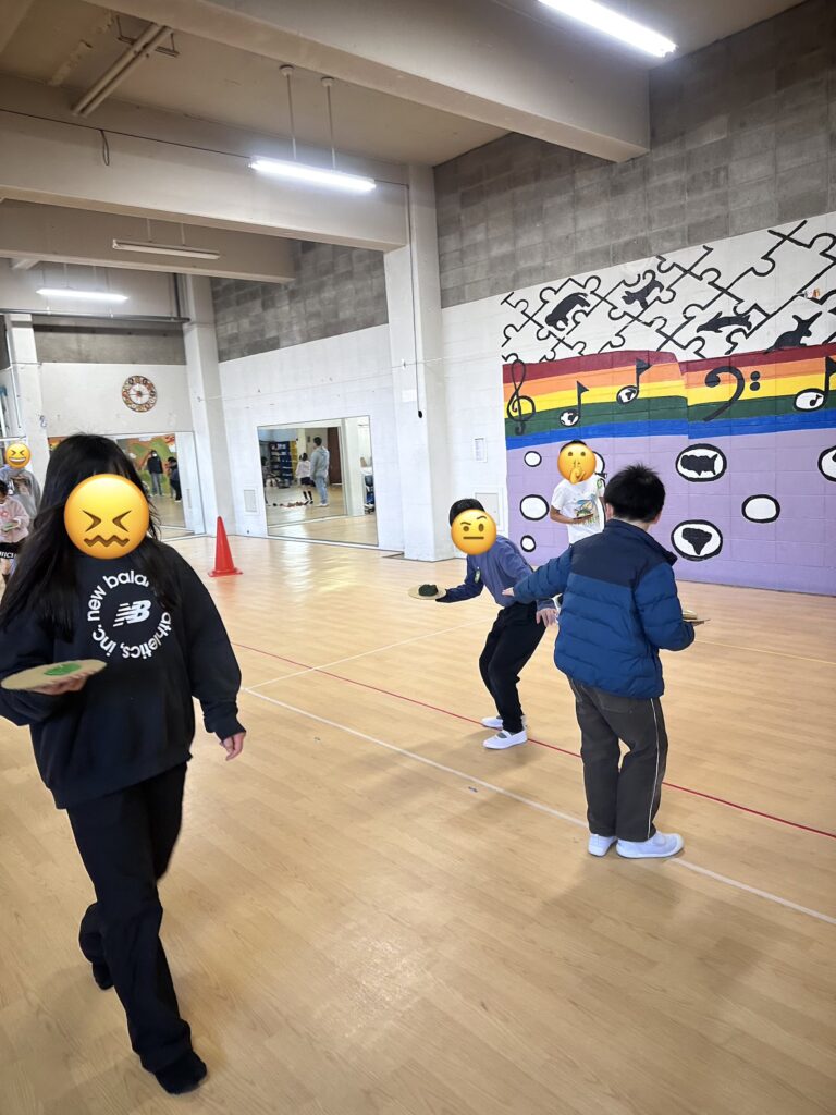 PinkクラスとPurpleクラスは今日、競争心あふれる「ウェイター」ゲームに挑戦しました!お互いのチームが相手の皿を床に落とすのを阻止しつつ、先生方が注文した料理を慎重に運ぶ必要がありました。チームワーク、バランス感覚、素早い判断力を養う活気あふれる活動でした。カフェのギャルソン気分を味わえたことと思います!