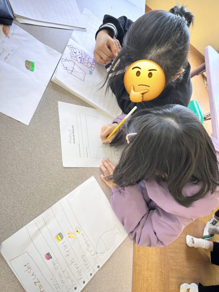 The elementary class continued planning for their restaurant menu items. Today, they were asked to draw and think about what kinds of craft materials they will need to make their food items. They discussed with their team members and wrote down a list to look in the craft room later.