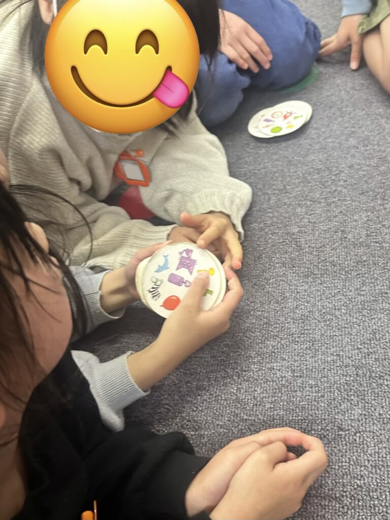 Today, Blue Class learned the phrase, “I have got a…” To practice, they played the card game Spot It. Each team was given a card, and if any picture on their card matched a picture on the card in the middle, they had to quickly shout the key phrase along with the picture name.