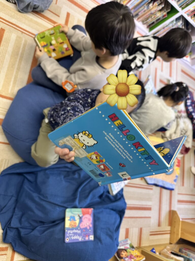 Owlsクラスの子どもたちは、図書室に行くのが大好きです!毎週、子どもたちは2階へ上がり、フォニックスの練習をしたり、先生が読み聞かせてくれる物語を聞いたりしています。最後に時間があれば、興味のある本を自由に探して読むこともできます。子どもたちは、本を持って先生のもとへ行き、知っている英語の単語を教えるのをとても楽しんでいます!