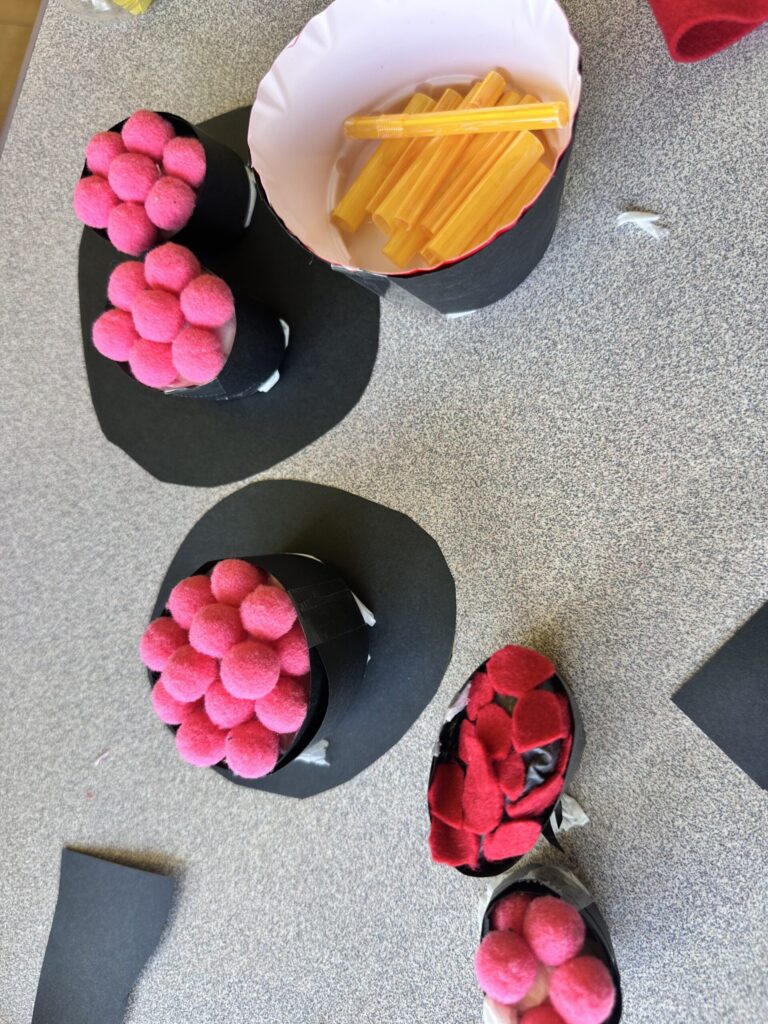 来週の大きなロールプレイに向けて、すべての小学生クラスの子どもたちがレストランの料理の仕上げに一生懸命取り組んでいました!ほぼ完成しているクラスもあれば、メニューの最後の数品を急いで仕上げているクラスもありました。中には、メニューの料理を1品ずつしか作らなかったクラスもありました!つまり、その料理を注文できるのは、たった1人の幸運なお客様だけということですね。来週のロールプレイで、各レストランが限られたメニューをどのように対応していくのか、とても楽しみです!これは・・・フレンチフライといくらの軍艦巻きでしょうか?