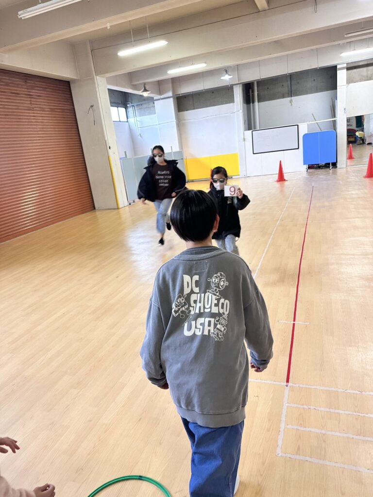 Advanced Green クラスは、この日もリレーゲームで盛り上がりました!先生が大きな数字を言い、子どもたちは教室の反対側まで走って数字のカードを取りに行きました。チームメイトと協力し合い、先生が言った数字の合計と同じ数字を作るよう努めました。正解の合計を最初に作り上げたチームがそのラウンドの勝者となりました!