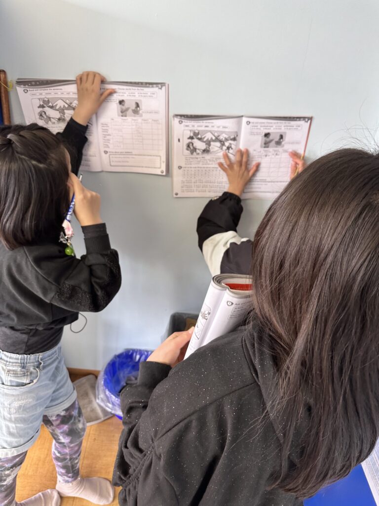 Pink and Purple have been practicing the past tense using “was” and “were.” Today, the children completed a table in their activity books by interviewing their classmates. They asked questions such as, “Where were you on (day) in the (morning/afternoon/evening)?” and recorded their friends’ answers.
