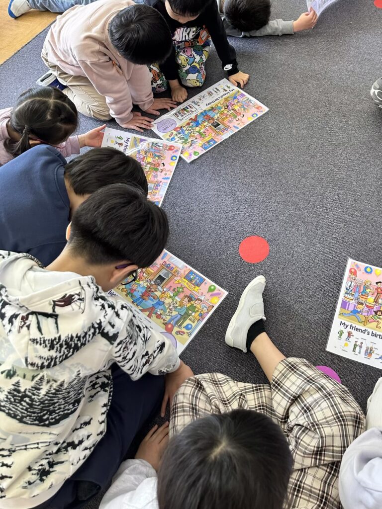 Red and Blue reviewed vocabulary using a YLE poster activity! The children took turns asking each other, “Can you find the…?” while their partners pointed to the item on the poster. Things became even more exciting when the activity turned into a “Who can find it faster?” challenge!