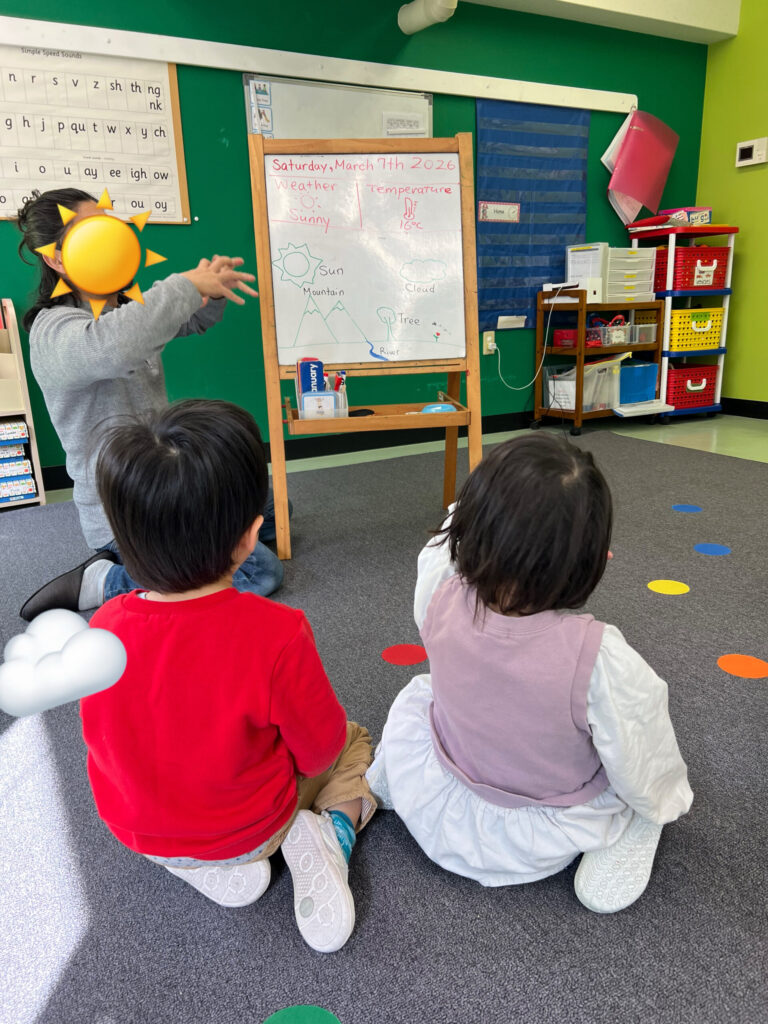 一日の始まりはサークルタイムから!みんなでお気に入りの天気の歌を歌います。