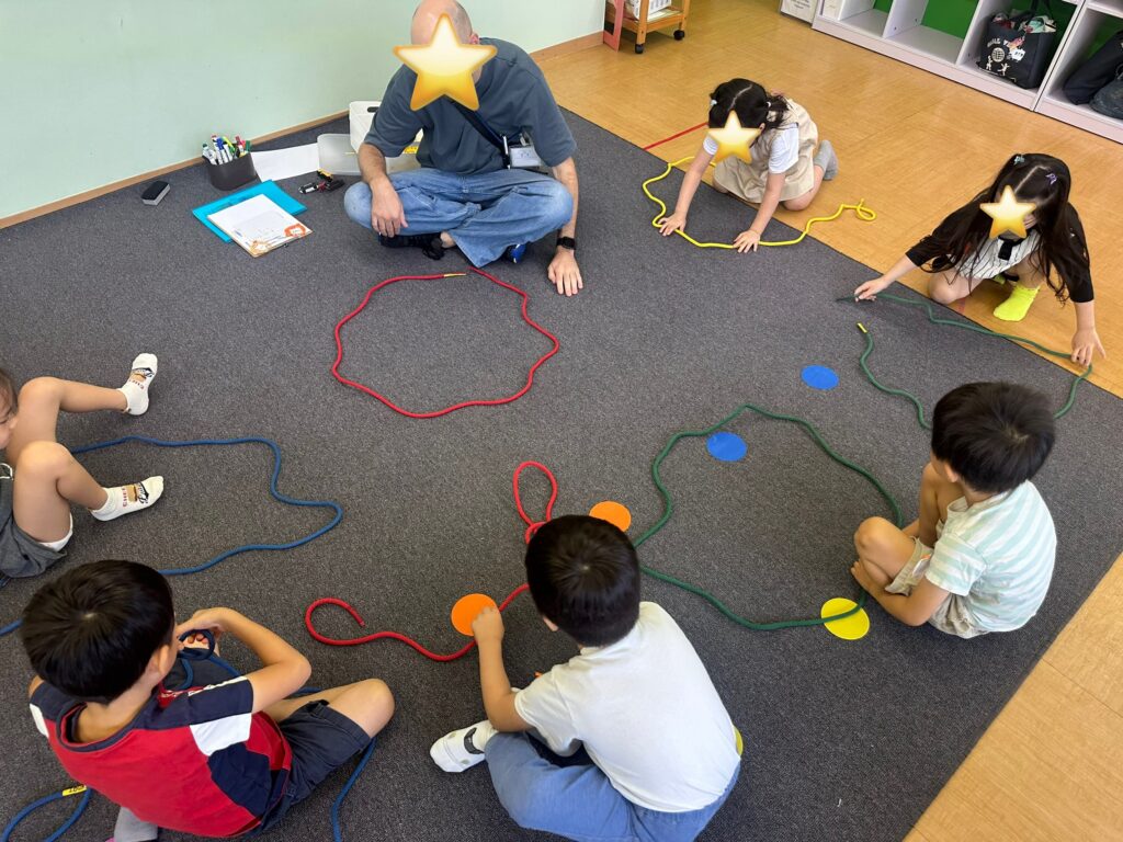 今日は「Communication and Language 1」のレッスンで、Owlsクラスは“形”について学びました!先生が形の名前を言うと、子どもたちはジャンプロープを使って、その形を床に作るために協力しました。