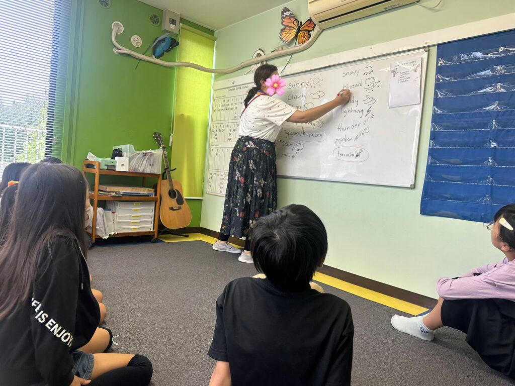 今日のコースブックのテーマは「自然災害」でした。子どもたちは、どんな天気が危険かを話し合い、その理由も説明しました。より活発なディスカッションにするため、クラスを2つのグループに分けて、みんなが自分の考えを積極的に共有できるようにしました。