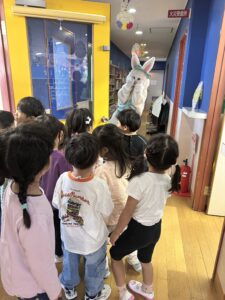 We had our Easter party today! Early in the morning, as the preschool classes were getting ready, the teachers suddenly announced, “Guess what, everyone? We have a special surprise for you today!” The children, a little surprised and very curious, went outside—only to discover the Easter Bunny hiding in the hallway!