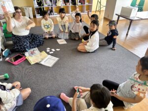 PinkクラスとPurpleクラスは、一緒にイースターパーティーゲームを楽しみました。番号の書かれた卵のカードが伏せられていて、1~10の順番にめくっていきます。番号が飛んでしまうと、相手チームが挑戦し、番号順にカードをめくれるよう番号の場所を記憶しておく必要があります。シンプルなゲームでしたが、子ども達はとても気に入ってくれました!