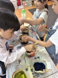 どのクラスでもEgg dye(卵染め)を行いました。卵染めをやったことがある子達は、どんなデザインにしたいか考えていて、どのイースターエッグも個性の光る作品となりました!