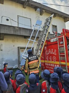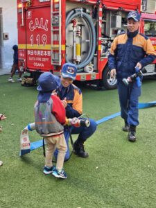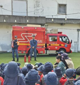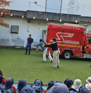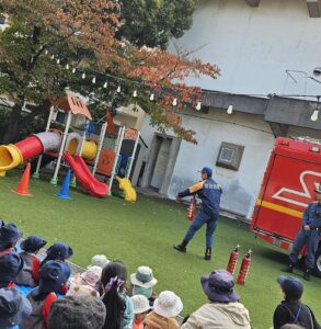 千里丘校では11月に、吹田市東署の消防職員さんにご来園いただき、総合避難訓練を実施しました。