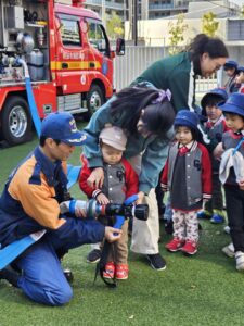 また、クラスごとに消防車両を見学させていただき、ホースを持たせてもらったり、はしごが伸びる様子を見たり、普段目にすることのない器具に興味津々の子どもたち。いちばん小さな Ladybugs クラスの子どもたちも、いろいろな設備に触れさせてもらい、とても嬉しそうでした。