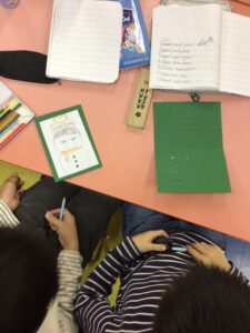 The final project was writing a summary of our year. For this, we thought back over the whole year, discussing major events and holidays and what we had done for them. At first, the children had difficulty recalling what they’d done but soon were telling their friends about their memories. Here, the children are presenting their summary to the class, having written it in their journals first. Presenting is a great way to give what we write a purpose and also to give us practice delivering a longer speech. The class is always very supportive and we’re often laughing as each child tries to make their speech funnier than the last.