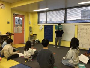 最後のプロジェクトは、1年のまとめを書くことでした。これに伴い、1年間のイベントや祝日などを振り返りました。初めはみんな「何をしたっけ?」と思い出すのに苦戦していましたが、すぐにお互いに思い出を話し合う姿が見られました。ジャーナルに1年間のまとめを書いたあと、クラスで発表しました。発表(プレゼンテーション)は、書いたものに目的を持たせると同時に、長めのスピーチを行う練習にもなります。Greenクラスはいつもとても協力的で、子どもたちは前の人よりも面白いスピーチをしようと工夫するので、よく笑いが起こります。