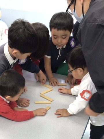 木製のピースを使って形を数えたり作ったりしながら、それぞれが工夫してピースを組み合わせ、様々な図形を完成させました。