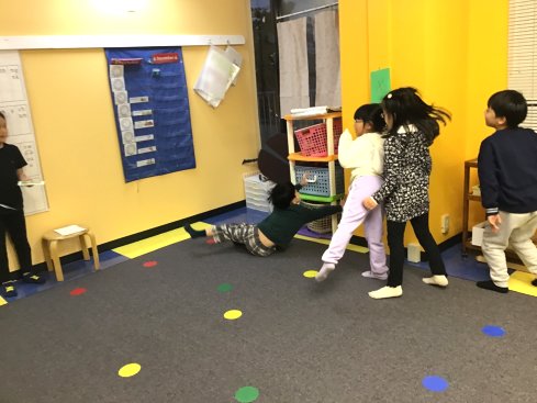 答えに応じて、壁に貼った「チェックマーク」か「×マーク」まで教室を走って横切るルールで、いつも大変盛り上がります。この日も何度も繰り返してチャレンジし、楽しく遊びながら学ぶことができました。